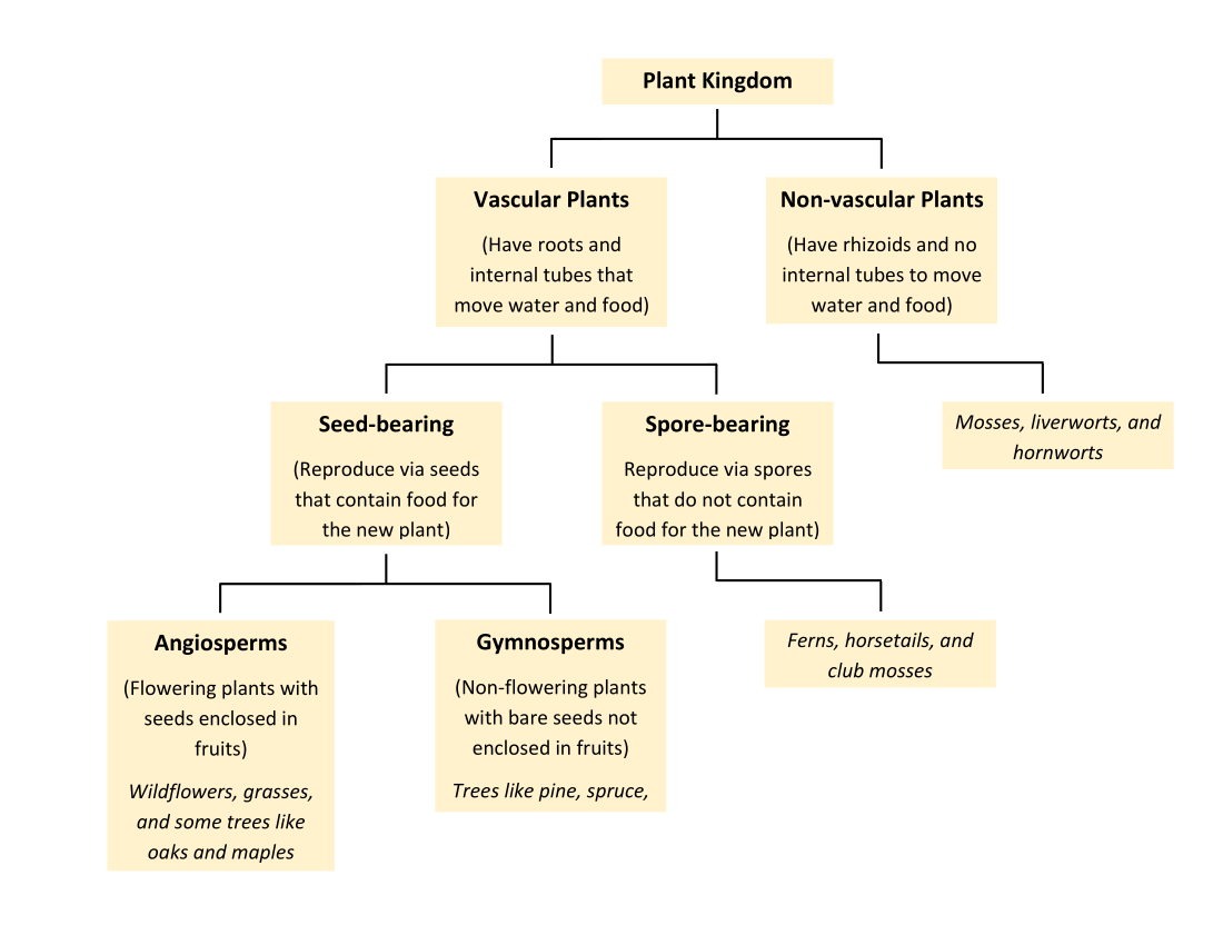 These differences in characteristics are used to group plants further into phyla, classes, orders, etc. This chart shows some of the main characteristics that are considered when classifying plants into groups.