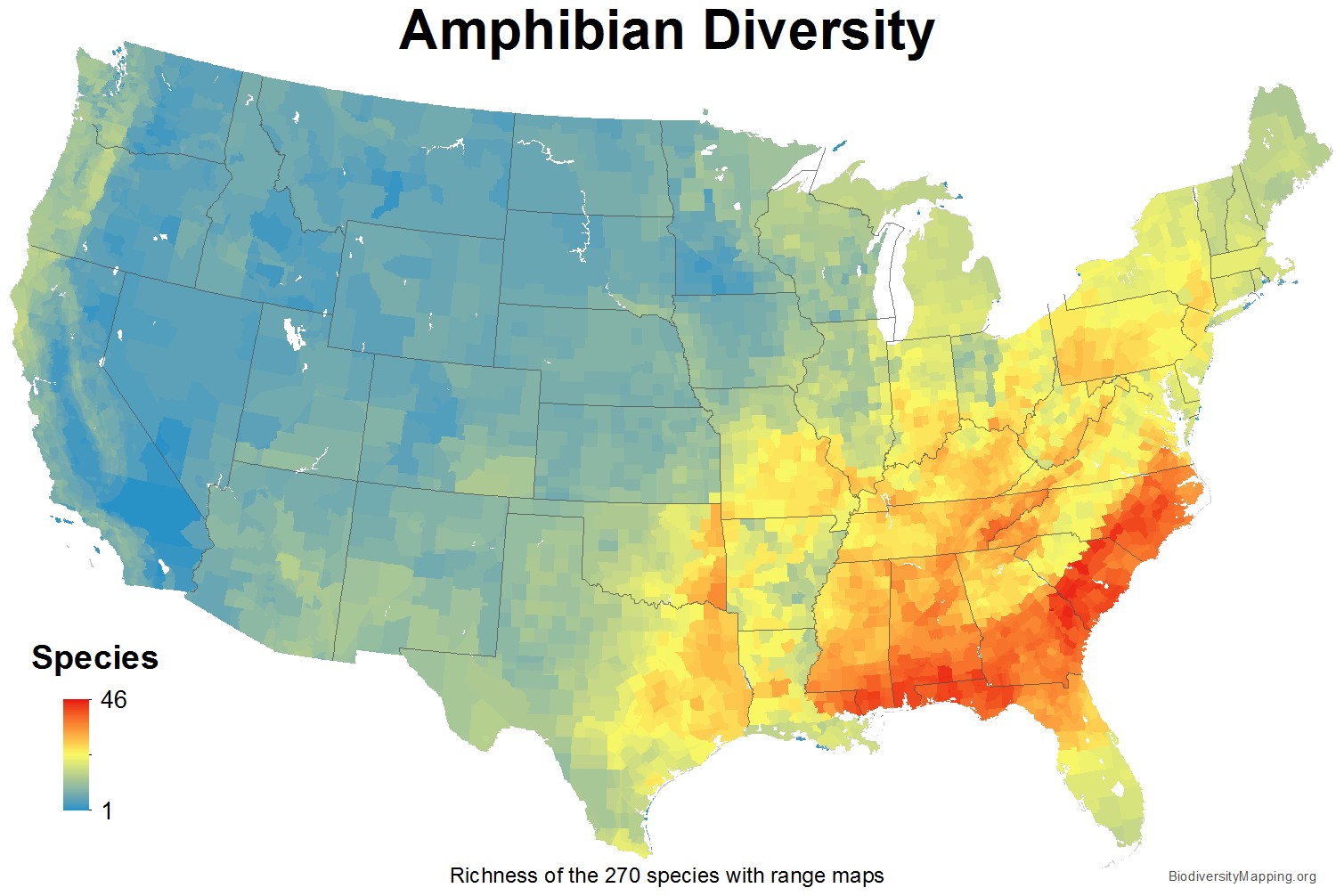 | Biodiversity Mapping Permission Details: Text and images on the Biodiversity Mapping website are for the personal, not-for-profit use by students, scholars, educational institutions, and the public. Any such use must name "BiodiversityMapping.org" as the source for the material, with acknowledgement of BirdLife International, IUCN, NatureServe, and USGS for their contribution of the species range map data used in producing these derived works. No further permission is needed for educational use. Commercial use, electronic re-publication, or print publication of text or images is strictly prohibited without prior written permission. Jenkins, CN, KS Van Houtan, SL Pimm, JO Sexton (2015) US protected lands mismatch biodiversity priorities. PNAS 112(16), pp.5081-5086. |
