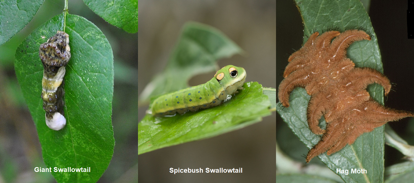 Some caterpillars are remarkably camouflaged or uniquely patterned in a manner to deter predators from eating them! Our native Giant Swallowtail caterpillar looks just like bird poop! Another native, the Spicebush Swallowtail’s caterpillar looks like a small snake or tree frog with very large eyes. The native Hag Moth caterpillar looks like a hairy spider with its flattened body and six pairs of curly, tentacle-like legs.
